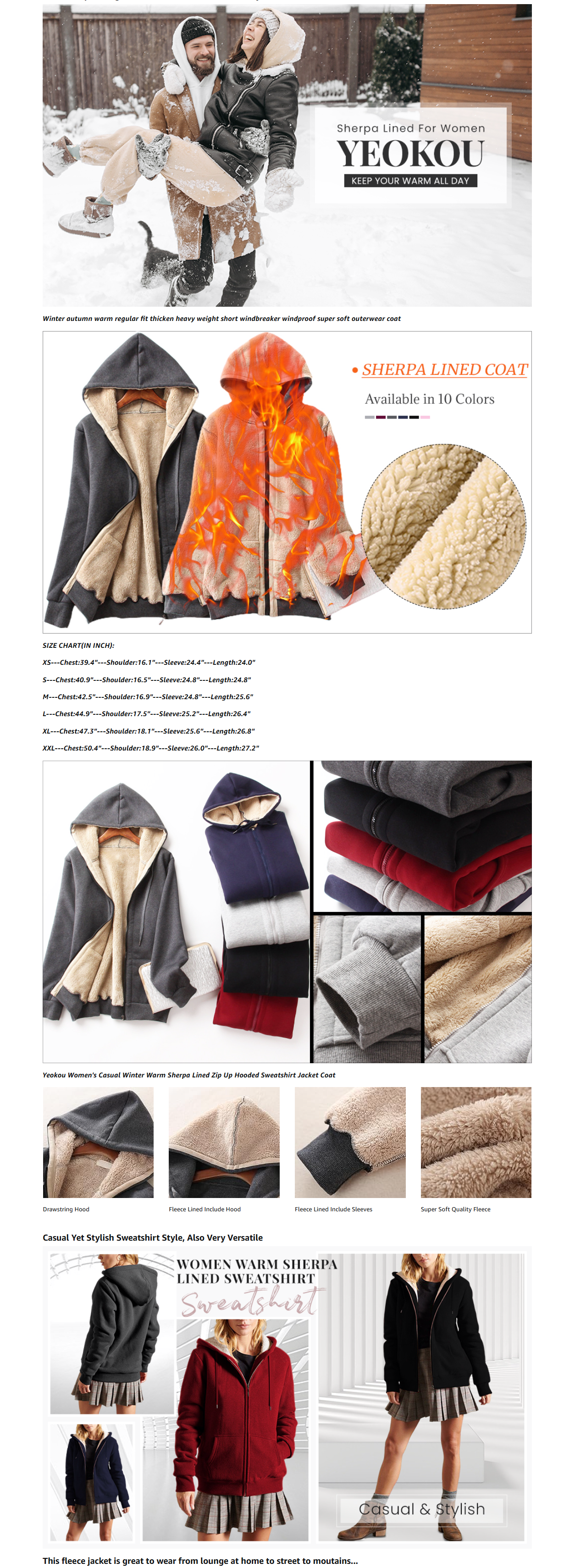 Yeokou Women's Casual Full Zip Up Sherpa Lined Hoodie Sweatshirt Jacket Coat